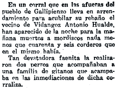 Como culpables de tal fechoría se señaló a los perros de unos gitanos que acampaban cerca de la corraliza en aquellos momentos.